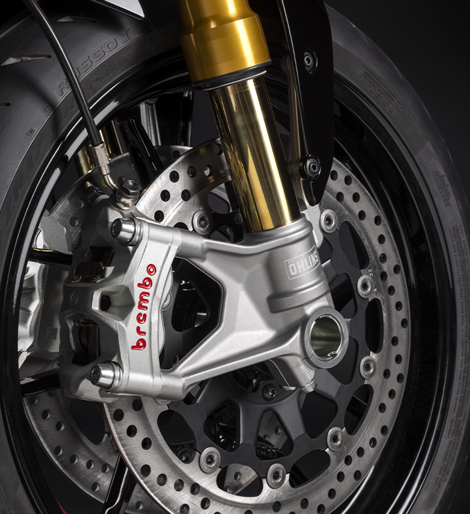 The golden Öhlins NIX30 fork enhances the sporty look of the new Monster SP. Together with Termignoni’s homologated silencer and Brembo Stylema® front calipers, they make up the valuable technical equipment capable of making the bike even lighter, more effective and fun in sporty riding, as well as more aesthetically appealing.