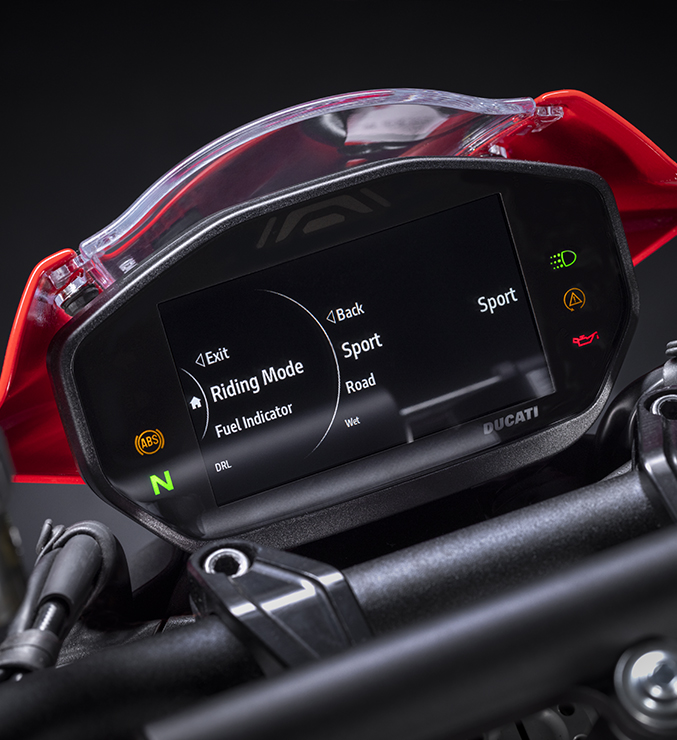 The electronic sector of the Monster is at the top of the segment. The standard equipment includes ABS Cornering, Ducati Traction Control and Ducati Wheelie Control, all adjustable to various levels of intervention. The sporty character of the new Monster SP is also underlined by the Launch Control which ensures lightning-fast starts. This top-of-the-range motorcycle equipment allows the Monster SP to safely express its full performance.