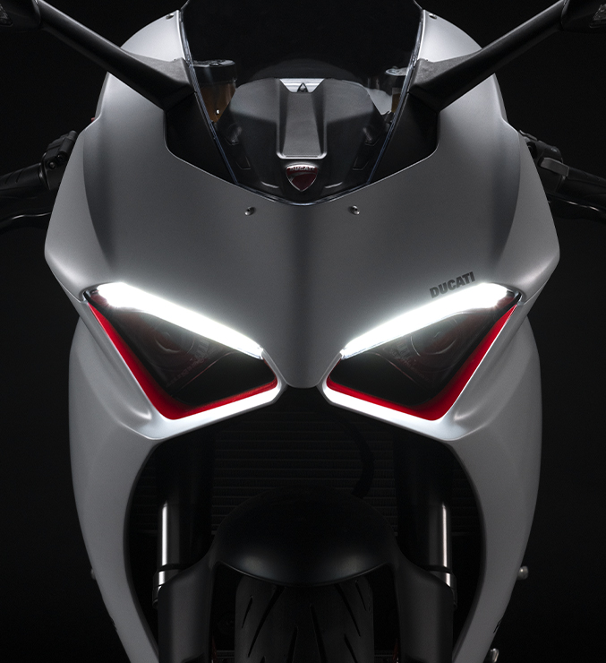 Dominating the front end are the two large air intakes, the upper parts of which incorporate the full-LED headlight. The new intakes merge with the existing air feed layout via newly designed ducts that, delivery rates remaining equal, lose less pressure than the previous ones, thus boosting intake efficiency. The headlight has been compacted with the express intent of giving the intakes themselves – especially with the bike at standstill – a more menacing air.