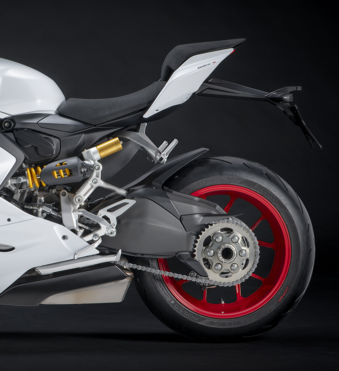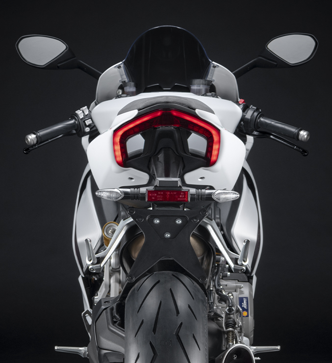 The tail is built on a steel Trellis subframe lined with plastic covers that runs from the vertical cylinder to the tailpiece, of winged, spoiler-like design. The tailpiece incorporates the full-LED tail light, also wing-shaped: while a one-piece assembly, the light has two distinct parts as per Ducati sports bike tradition.